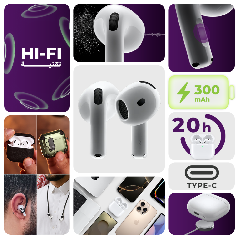صوت قوي، عزل ضوضاء، تحكم باللمس، متوافقة مع جميع الأجهزة، شحن لاسلكي وType-C، وإكسسوارات مميزة.